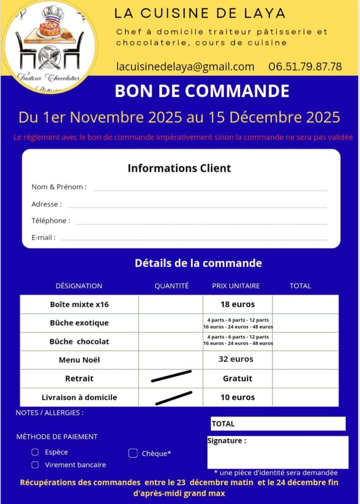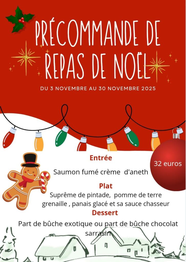 Vous avez la possibilité de précommander vos menus , ballotins et bûches dès maintenant et cela jusqu’au 30 Novembre pour les menus et jusqu’au 15 Décembre pour les ballotins et bûches.